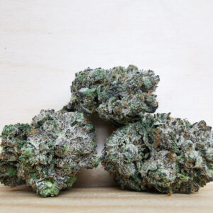 Blue Dream is a slightly sativa dominant hybrid (60% sativa/40% indica) strain that is a potent cross between the hugely popular Blueberry X Haze strains. This infamous bud boasts a moderately high THC level that ranges from 17-24% on average and a myriad of both indica and sativa effects. Users describe the Blue Dream high as having an immediate onset of an uplifting cerebral head high that leaves you completely motivated and focused with waves of creative energy that hit quickly and hard. This is accompanied by a mellow relaxing body high that leaves you warmed, numb, and completely pain free. Due to these potent combination effects, Blue Dream is said to be an ideal strain for treating patients suffering from conditions such as chronic stress, chronic pain due to injury or illness, mild to moderate cases of depression, and sleep disorders, including insomnia. Blue Dream has a delicious aroma of sweet blueberry pie and a taste of sugary sweet blueberries that stays on your tongue long after smoking. This bud has large dense yet fluffy popcorn-shaped bright neon green nugs with amber and blue hairs and rich blue undertones. These nugs are dusted with a fine layer of sandy milky white trichomes and sweet sticky resin.