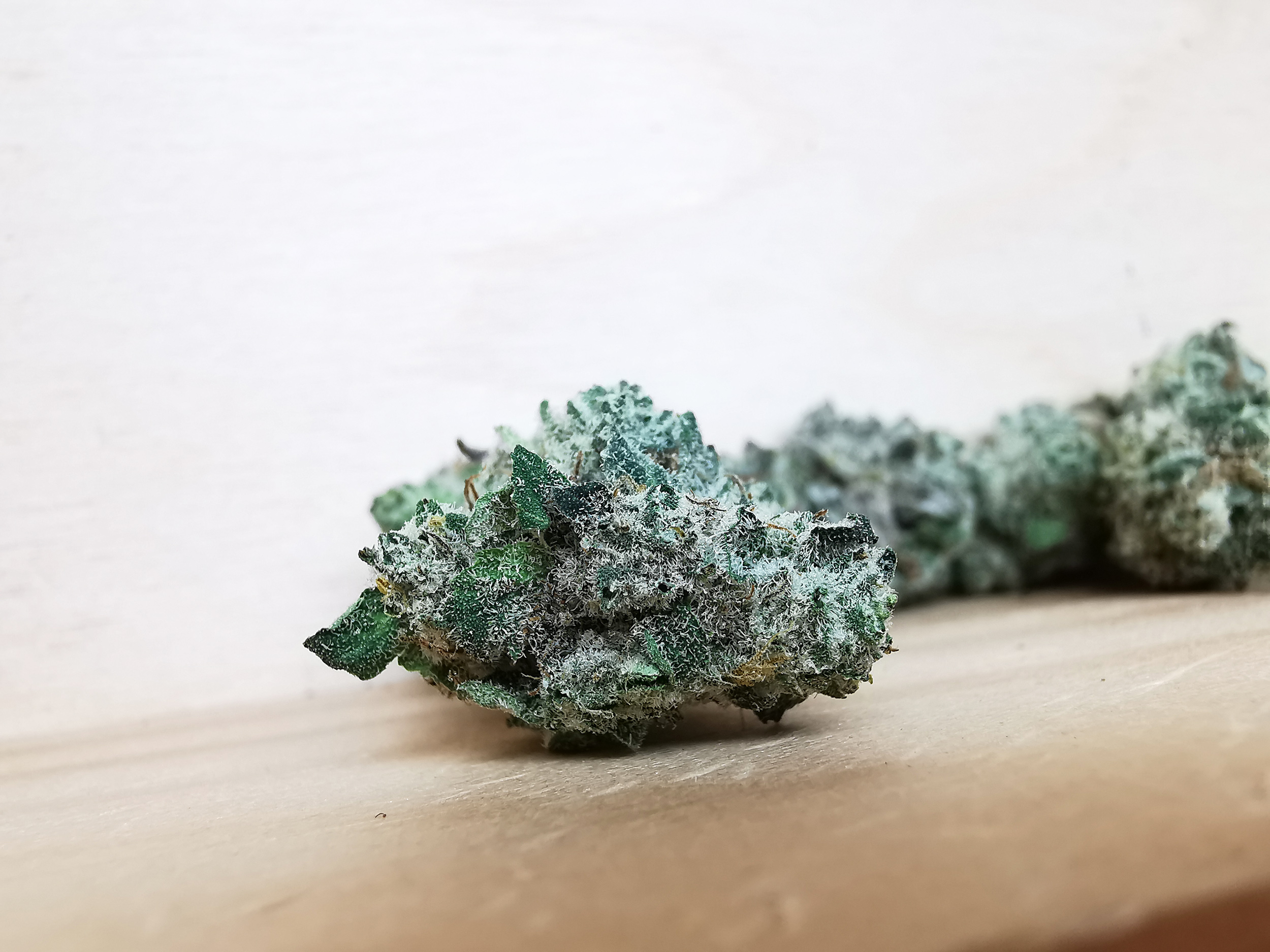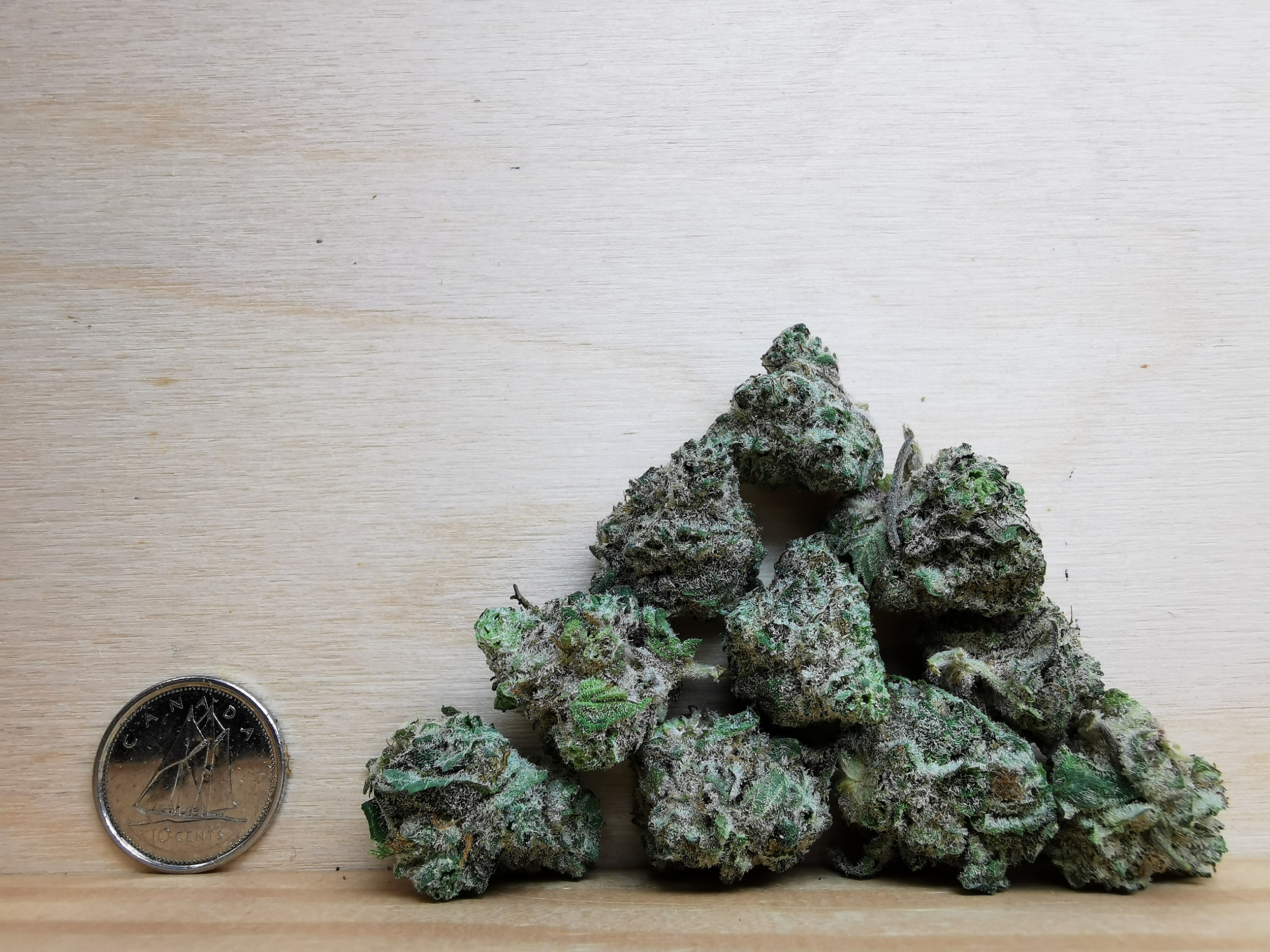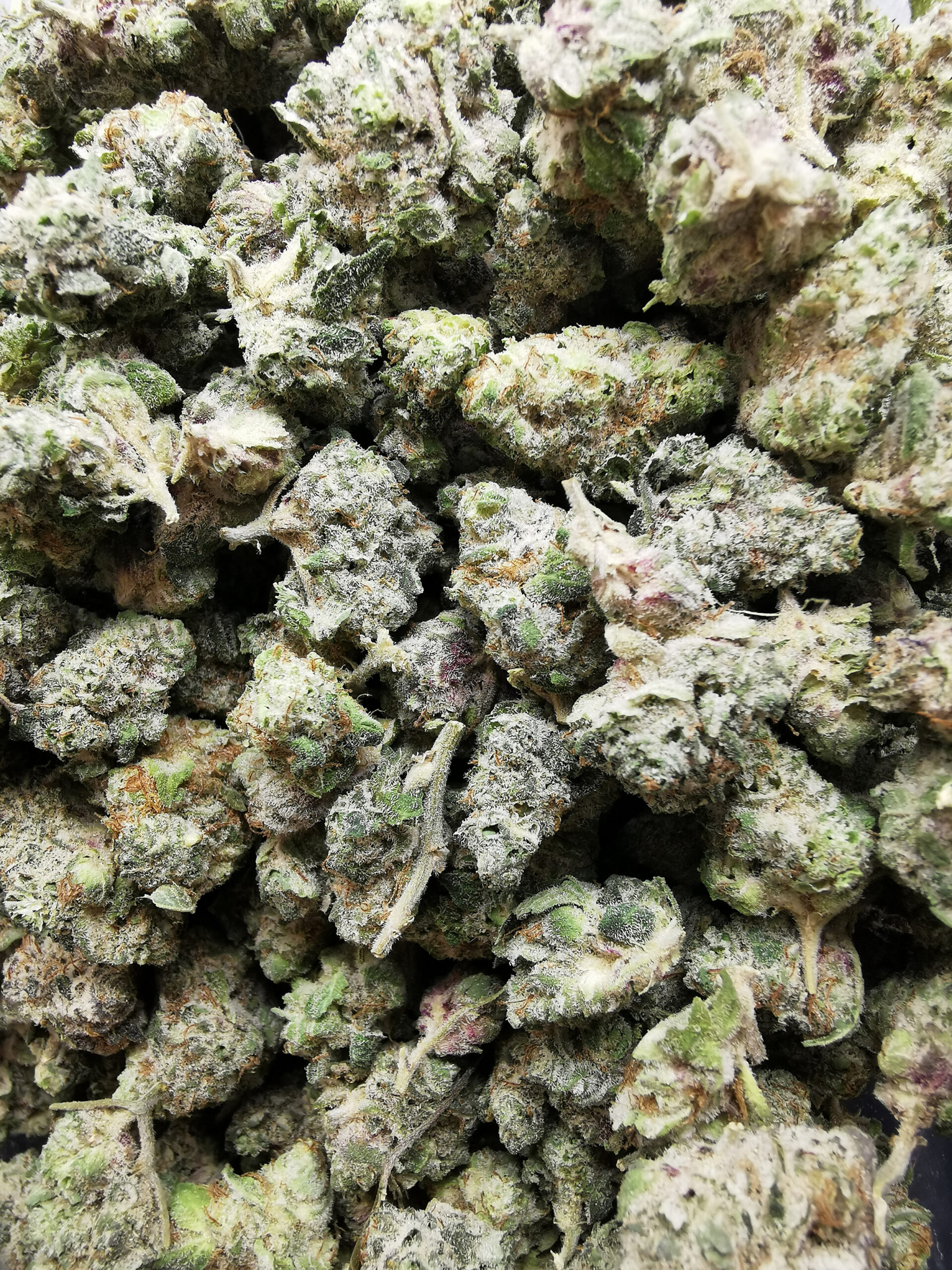 Small, dense, trichome-coated buds