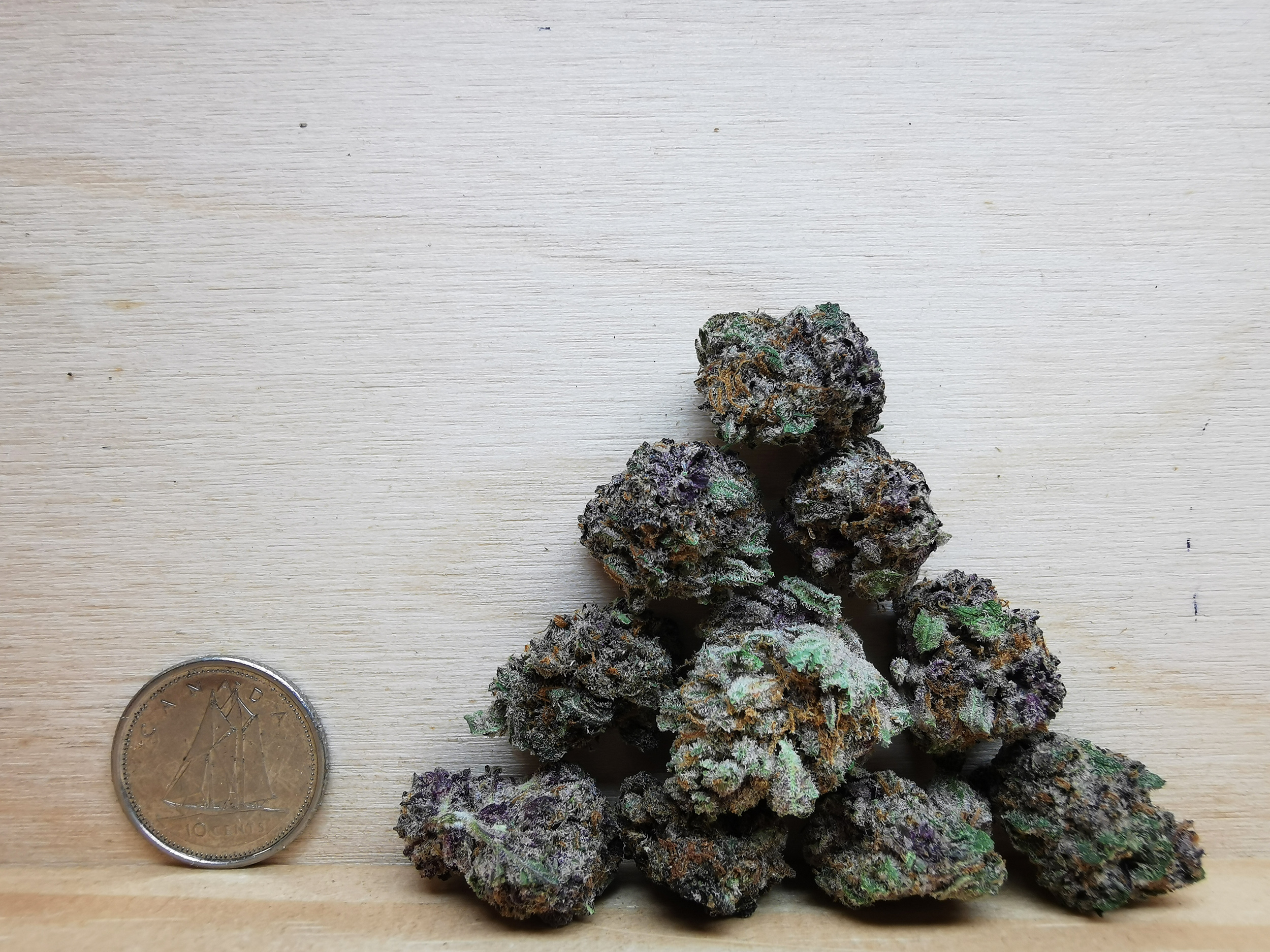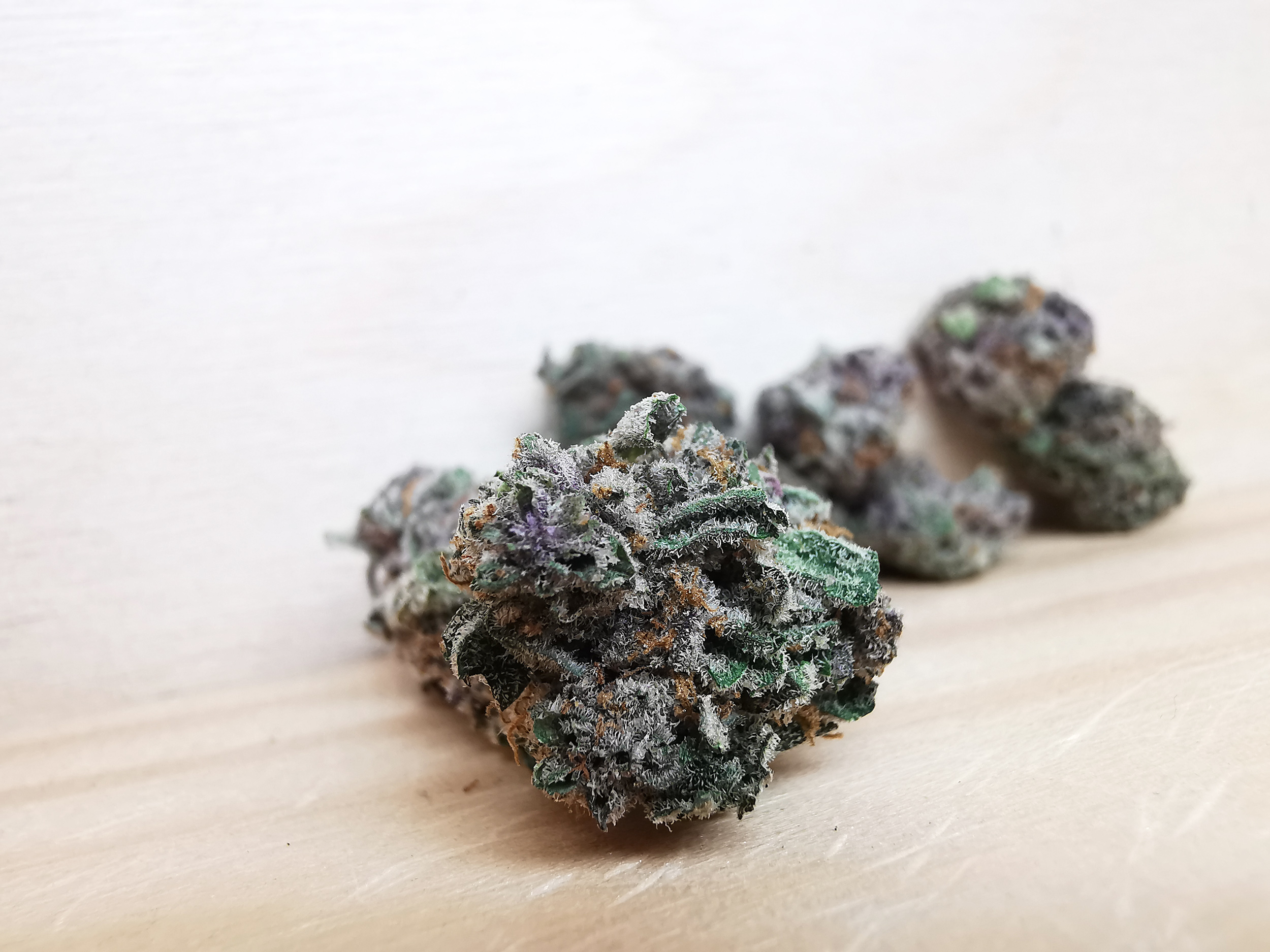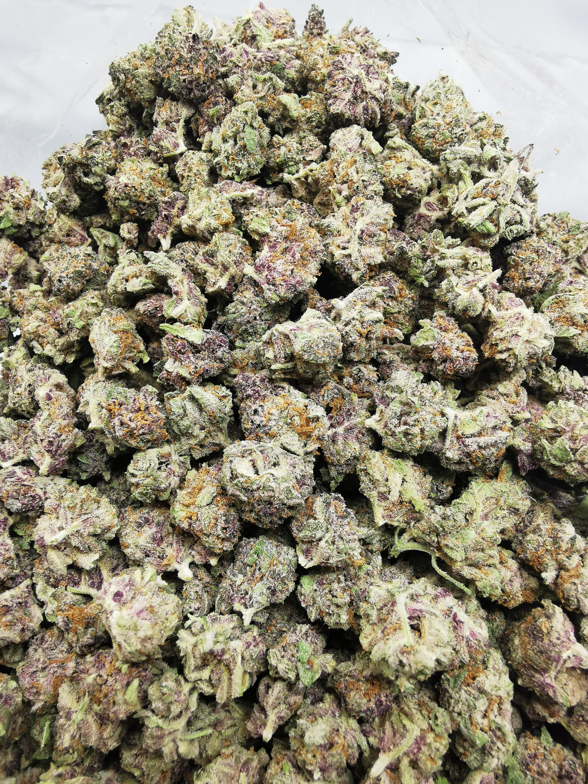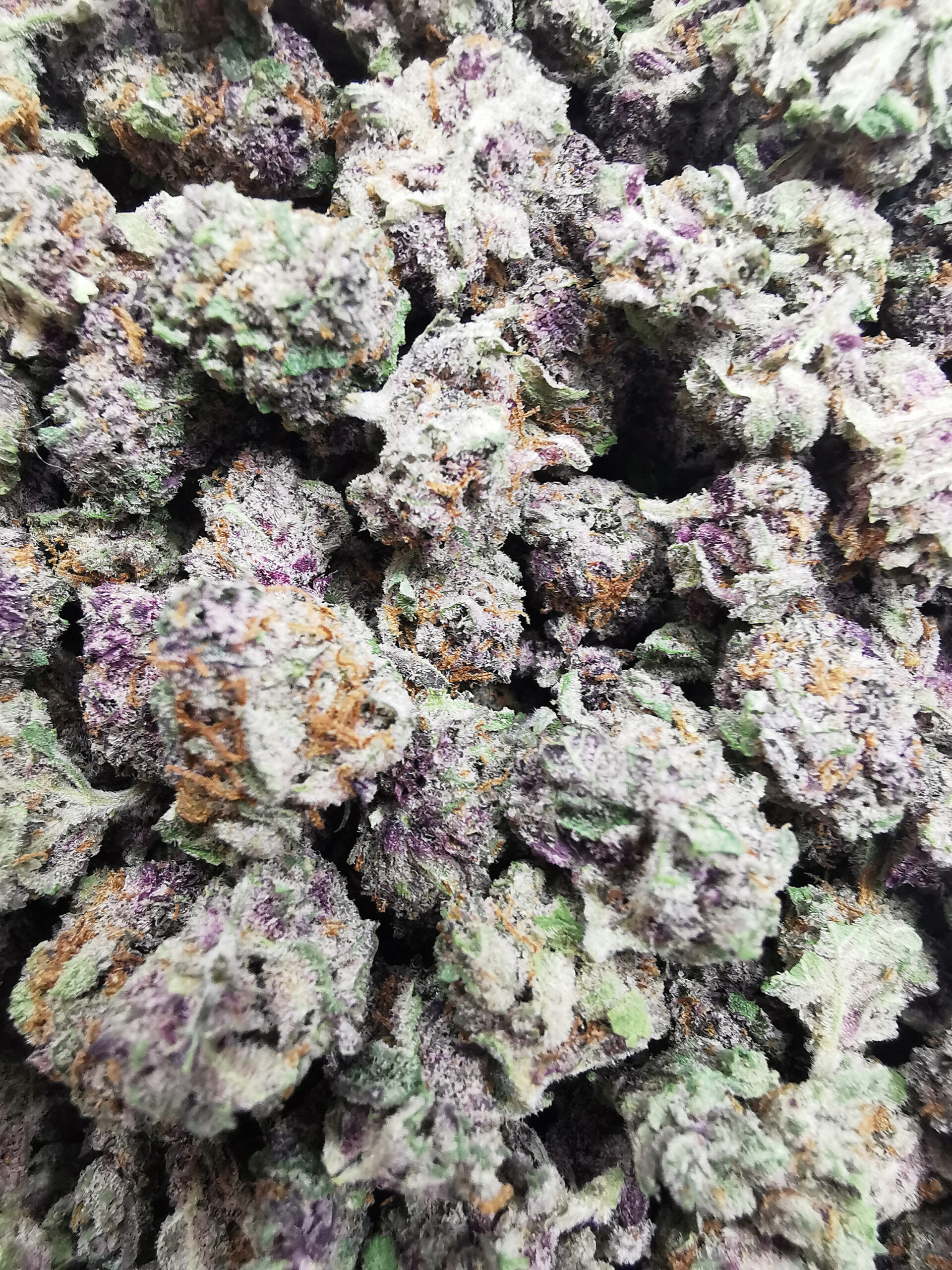 - Green tones with occasional purple hues and frosty trichome coverage