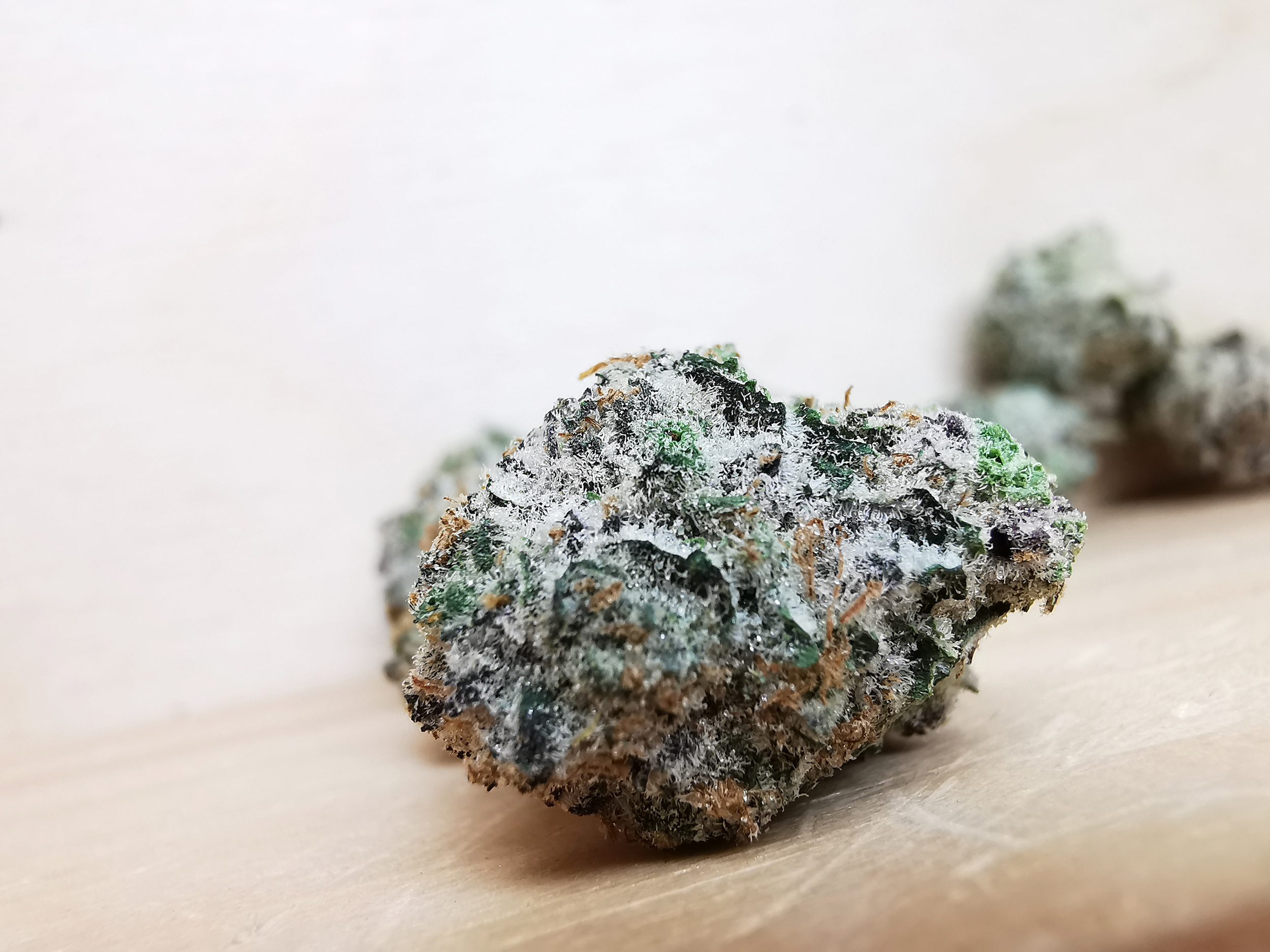 Silvery frost from heavy trichome coverage gives it serious bag appeal