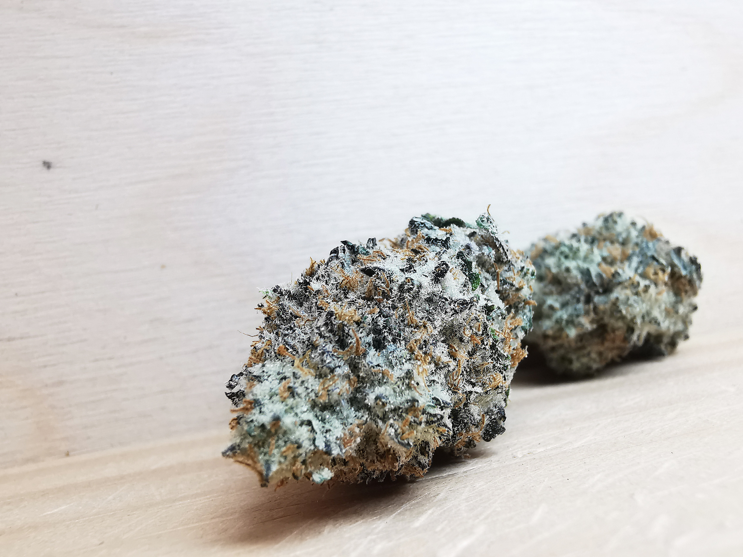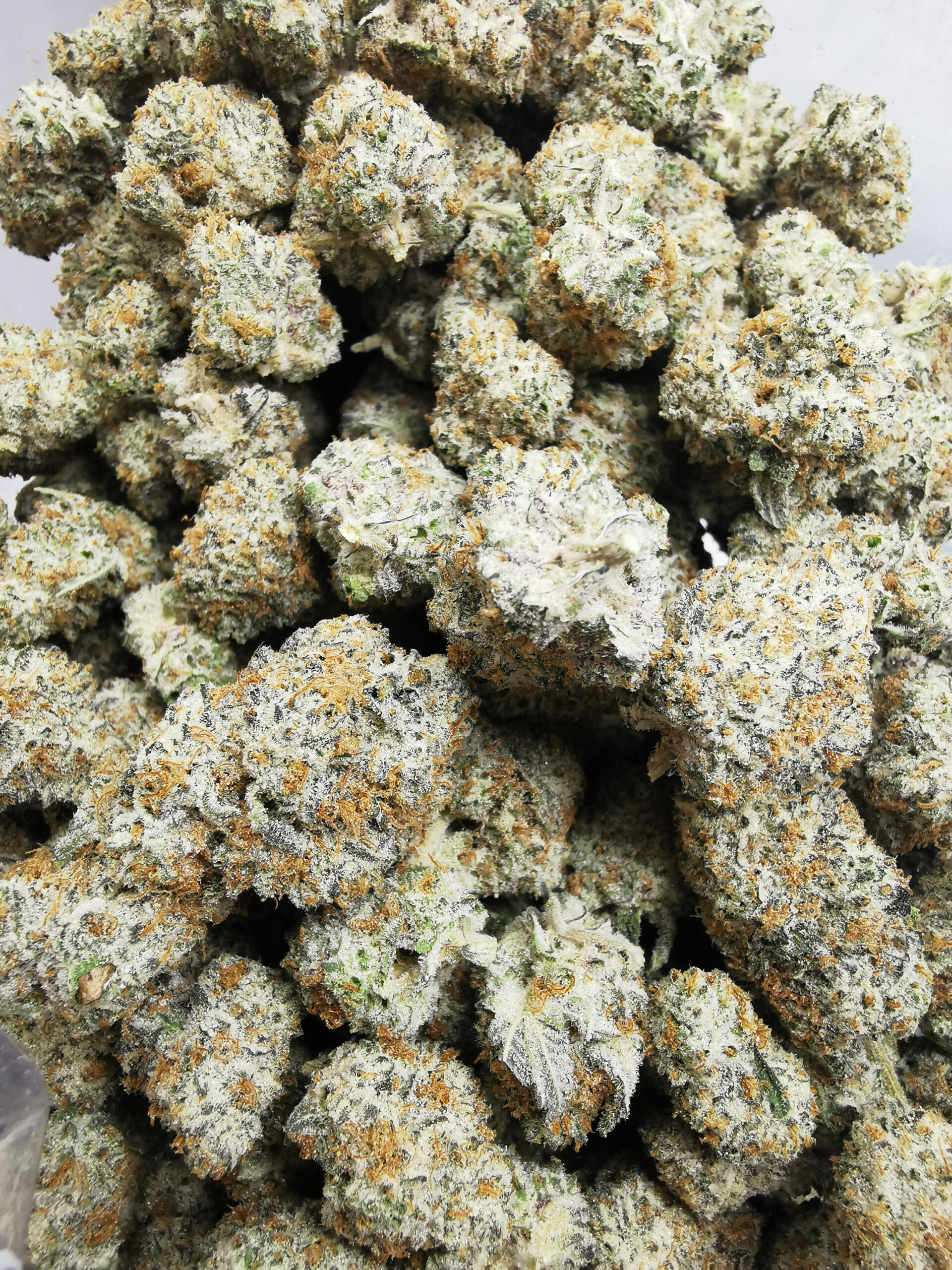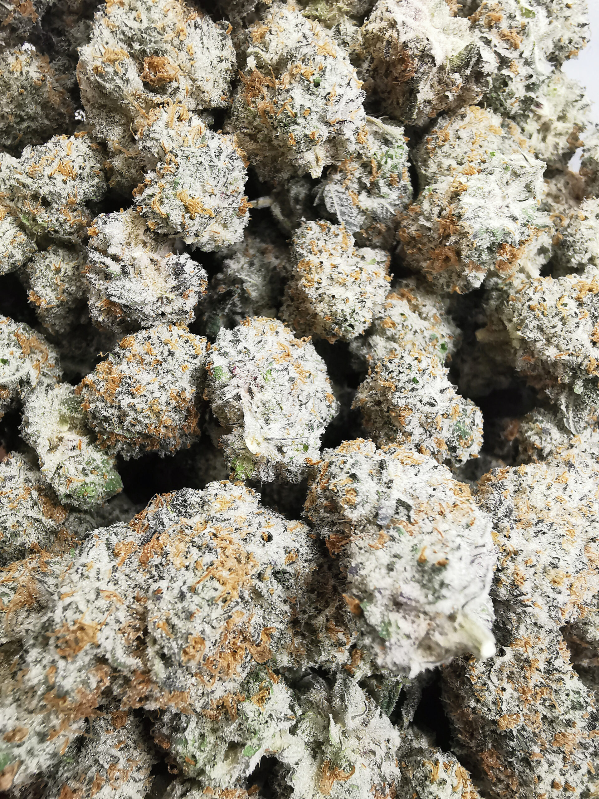 - Light green with orange pistils and frosty trichome coverage