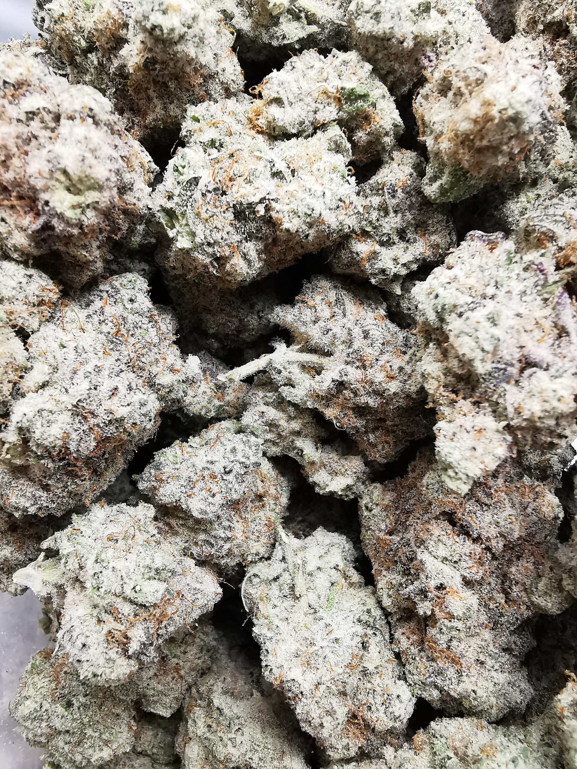 Green Valley’s MAC #1 is a visual stunner. The buds are incredibly dense and rock-hard, characteristic of true top-shelf genetics. Under the light, these nugs look almost white, buried under a heavy blanket of milky, diamond-like trichomes that hint at its high potency. Beneath the frost, you’ll find deep olive greens and rich purple hues tightly woven with bright orange pistils.