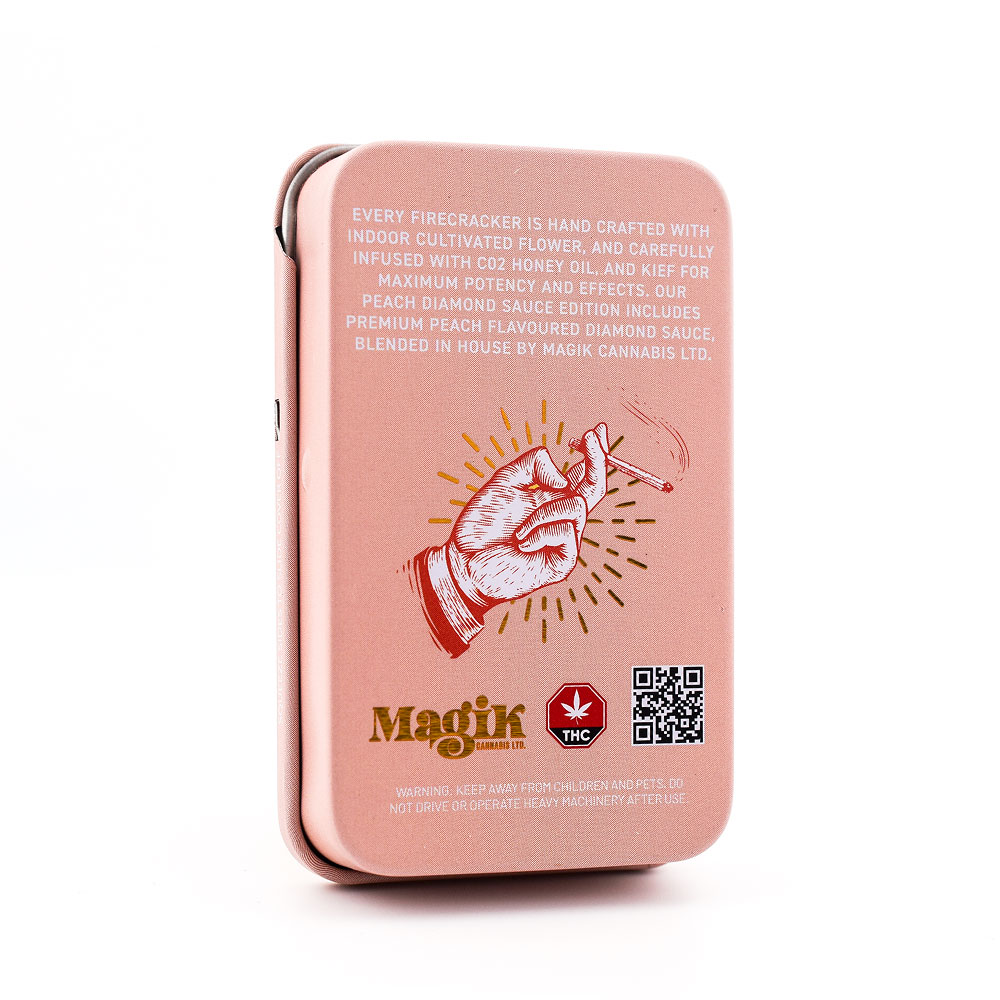 Magik redefines the Firecracker experience with the Peach Diamond Sauce Edition — a bold union of premium hand-trimmed flower, THC-A diamond-rich peach diamond sauce, and luscious fruit-forward terpenes. Expect vibrant flavour, effortlessly smooth smoke, and an elevated, euphoric high that hits as sweet and refreshing as biting into a sun-ripened peach. Crafted for flavour seekers and potency chasers alike, these infused pre-rolls deliver luxury taste and heavyweight effects in every session.